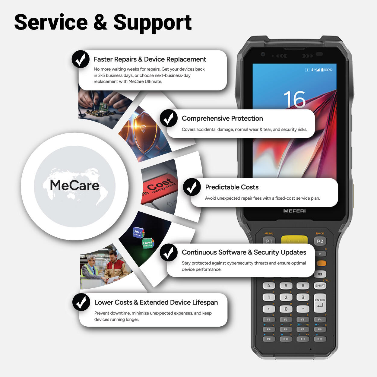 Ως ISV, η απρόσκοπτη λειτουργία των εφαρμογών σας είναι ζωτικής σημασίας για τη φήμη σας. Το πρόγραμμα υποστήριξης MeCare προστατεύει την επένδυσή σας και εξασφαλίζει την αδιάλειπτη απόδοση των συσκευών, υποστηρίζοντας εσάς και τους πελάτες σαςΒασικά Πλεονεκτήματα του MeCare:Ταχύτερες Επισκευές & Αντικατάσταση: Ελαχιστοποιήστε τον χρόνο εκτός λειτουργίας. Επισκευάζουμε τις συσκευές σας μέσα σε 3-5 εργάσιμες ημέρες ή σας παρέχουμε αντικατάσταση την επόμενη ημέρα με το πακέτο MeCare Ultimate.